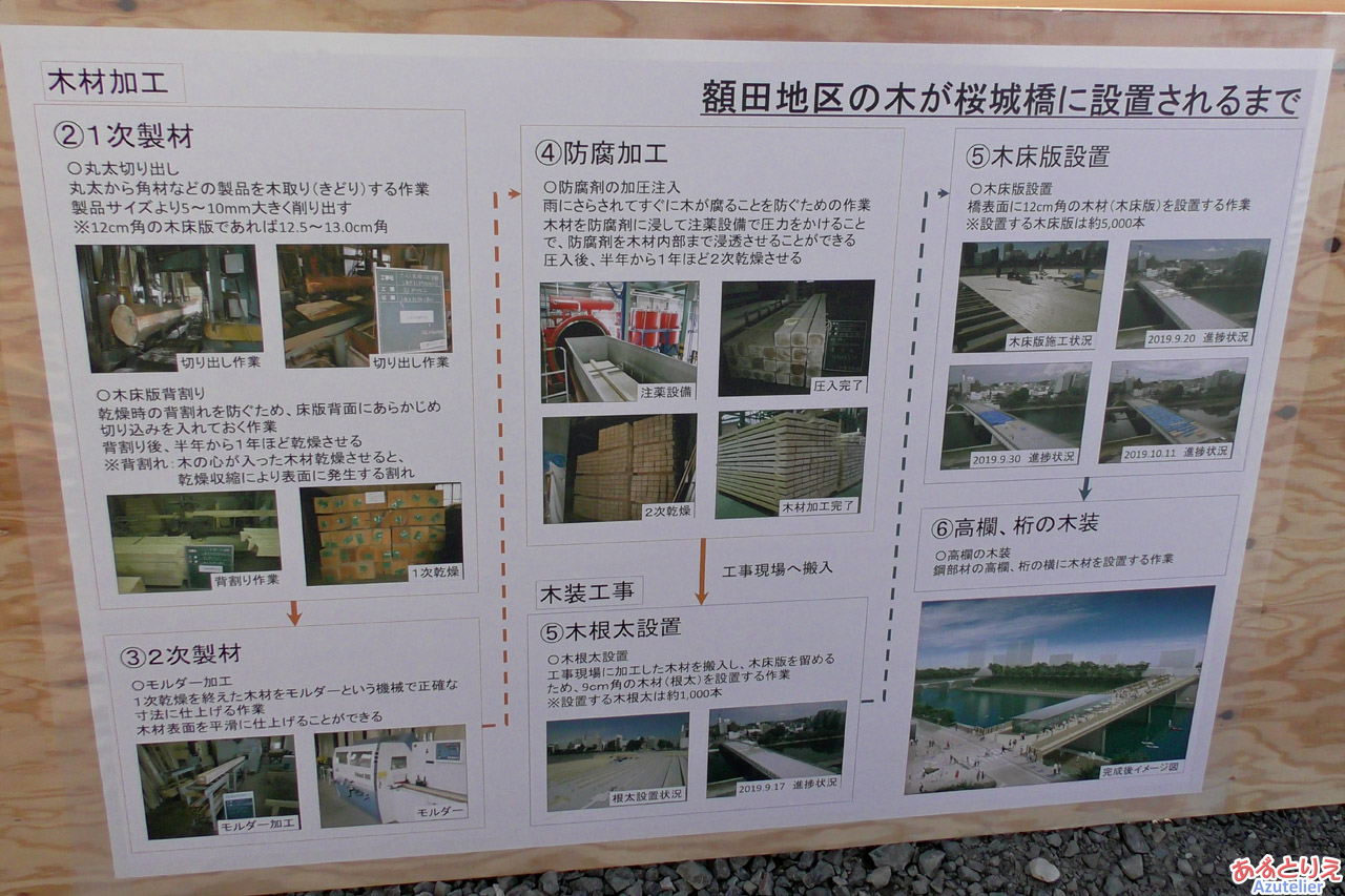 橋表面に12㎝角の木材(木床版)を設置する作業