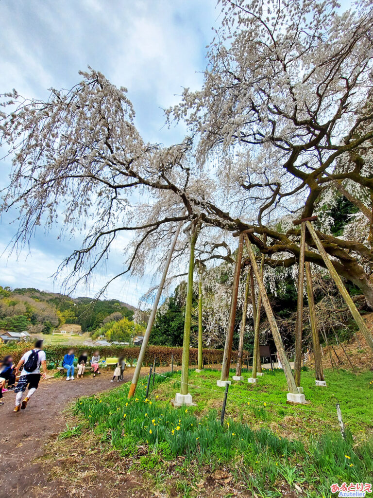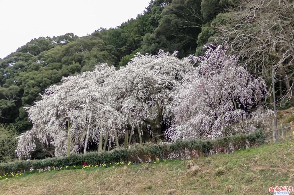 胸高囲2.4m、根囲2.25m、樹高17m、枝張りは東西15m、南北17mに及ぶ、 エドヒガンの枝垂れ品です。とても美しい形をしています。