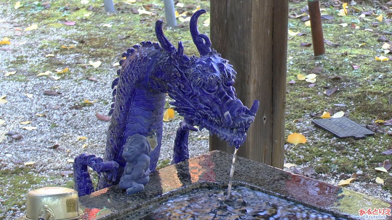 手水舎の水が出てくる龍が、瑠璃色で綺麗です。 でもただ、この龍は陶器製なので、あちこちがポキポキぱりぱり割れてしまっているのが残念です…。