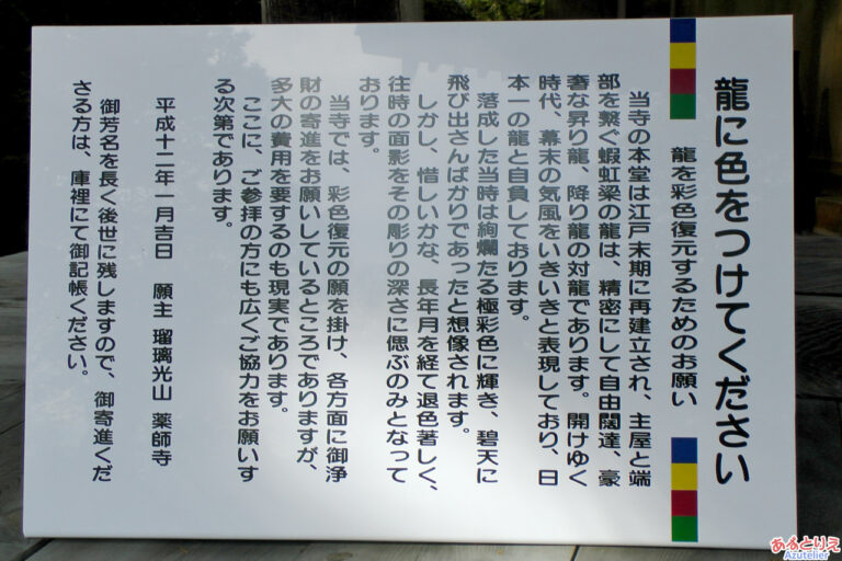当寺では、彩色復元の願を掛け、各方面にご浄財の寄進をお願いしているところでありますが、多大の費用を要するのも現実であります。