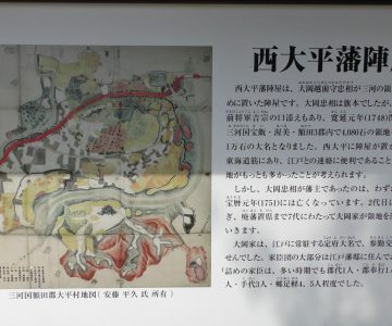 西大平藩陣屋は、大岡越前守忠相が三河の領地を治めるために置いた陣屋です。大岡忠相は旗本でしたが、72歳の時に前の将軍、吉宗の口添えもあり、寛延元年(1748)旧暦10月1日に三河国宝飯(ほい)・渥美(あつみ)・額田(ぬかたぬかた)3郡内で4080石の領地を加増され、1万石の大名となりました。西大平に陣屋が置かれたのは、東海道筋にあり、江戸との連絡に便利であること、三河の領地が最も多かったことが考えられます。