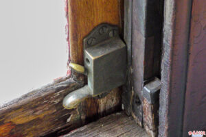 窓のロックです。 窓の左右に付いていて、左右のロックを同時に挟むとロックが解除されるので、窓を上にあげると、ちょうど良い位置でまたロックがかかるという仕組みになっています。 ちなみに窓枠は、木で出来ていますね。